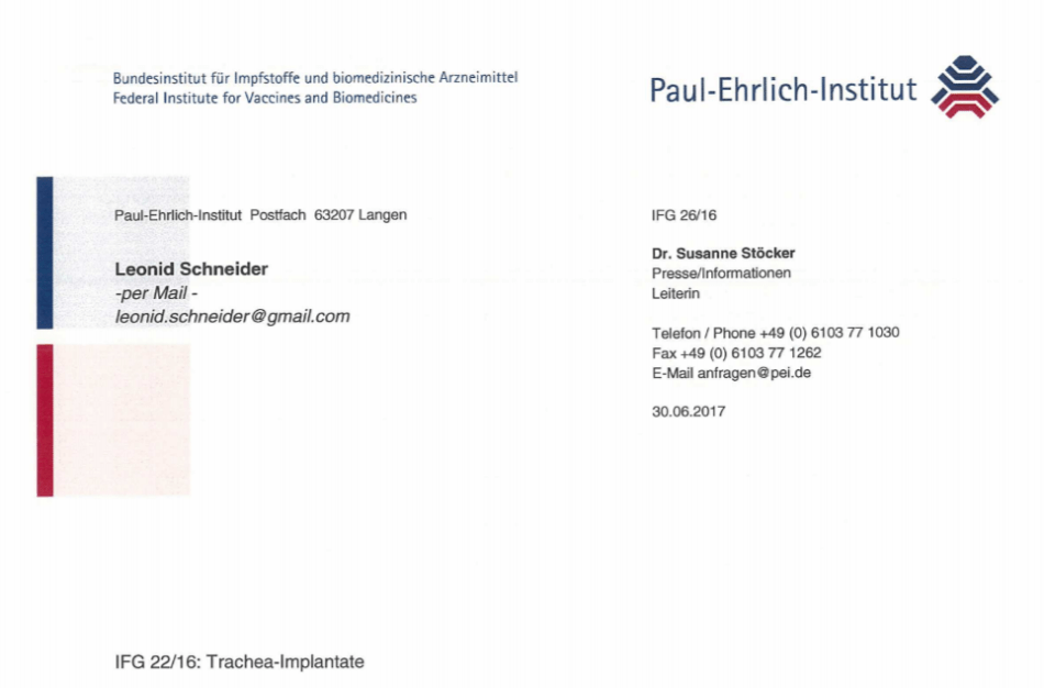 The German trachea transplanters Heike and Thorsten Walles treated the 3 patients with their pig-intestine-based tracheal transplants (one of them performed with Paolo Macchiarini). They are currently suing me in court for reporting about those, while their employer, the University of Würzburg, investigates these tracheal transplants together with the evidence for blatant data manipulations in several Walles publications on suspicion of misconduct. None of those 3 patients is alive today, yet Walles insist that neither of their transplant operations was in any way related to the patients deaths or that it might have reduced their quality of life. They keep declaring those operations as resounding successes, free from any evidence, though the last transplant was performed in 2009 and never again. A corresponding clinical trial, financed by the German Ministry of Education and Research with €1.5 Million between 2009 and 2015 (and briefly mentioned at the beginning of the PEI letter), did not achieve even a single milestone. Not even animal experiments were permitted by the responsible watchdog institution, the Paul Ehrlich Institute (PEI). For almost 7 months, PEI refused to answer my Freedom of Information inquiry. It seems however, my complaints to authorities and the Federal Ministry of Health, finally had an effect.