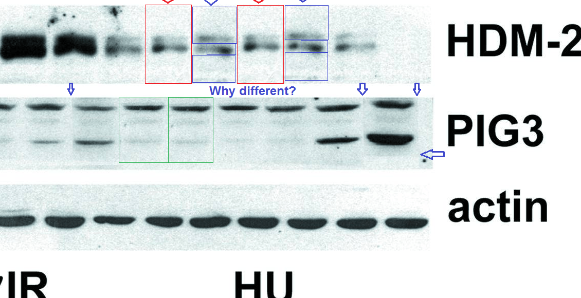 There is plenty more suspiciously spliced gels from Prives lab at Columbia University (e.g., Gaiddon et al JBC 2007 or Okamoto et al, Molecular Cell 2002), or those with suspected image duplications like Daftuar et al PLOS One 2013, or with such obvious duplications standing in for two different transgenic cell lines in Karni-Schmidt et al Oncogene 2007: