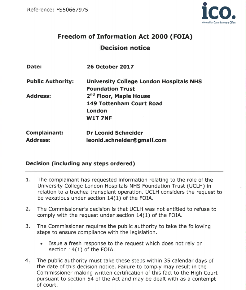 UCL fibs Parliament about trachea transplants