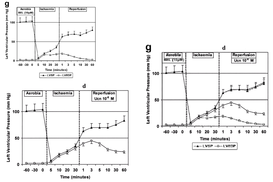 These studies (and plots) involved the removal of still-beating hearts from rats, partly to propitiate Wobbly John the Harvest God, and partly to keep them beating in a nutrient solution, there subjecting them to an interruption and restoration of the oxygen supply. The ischemic hearts may have been subsequently calcined and mingled with wine in an alchemical decoction which grants immortality to the partaker, but some information I cannot share. We have already met Refs. 3 and 5, in which the hearts were perfused beforehand or afterwards with minocycline and urocortin to reduce the damage, encouraging them to recover their function faster and more completely. Recall that the illustrations of ischemic damage in those papers all resolved on close inspection to a single image of a heart, variously retouched to show larger or smaller infarcts. A skeptical approach to the data is justified.