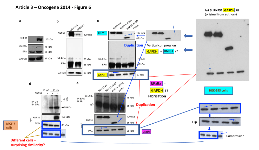 What is also obvious, is that the lower set of bands was used trice, in 2 different cell lines HEK293 and MCF7, and as signal for 2 different proteins: GAPDH and ERalpha. Without correct loading controls, all data becomes unreliable.