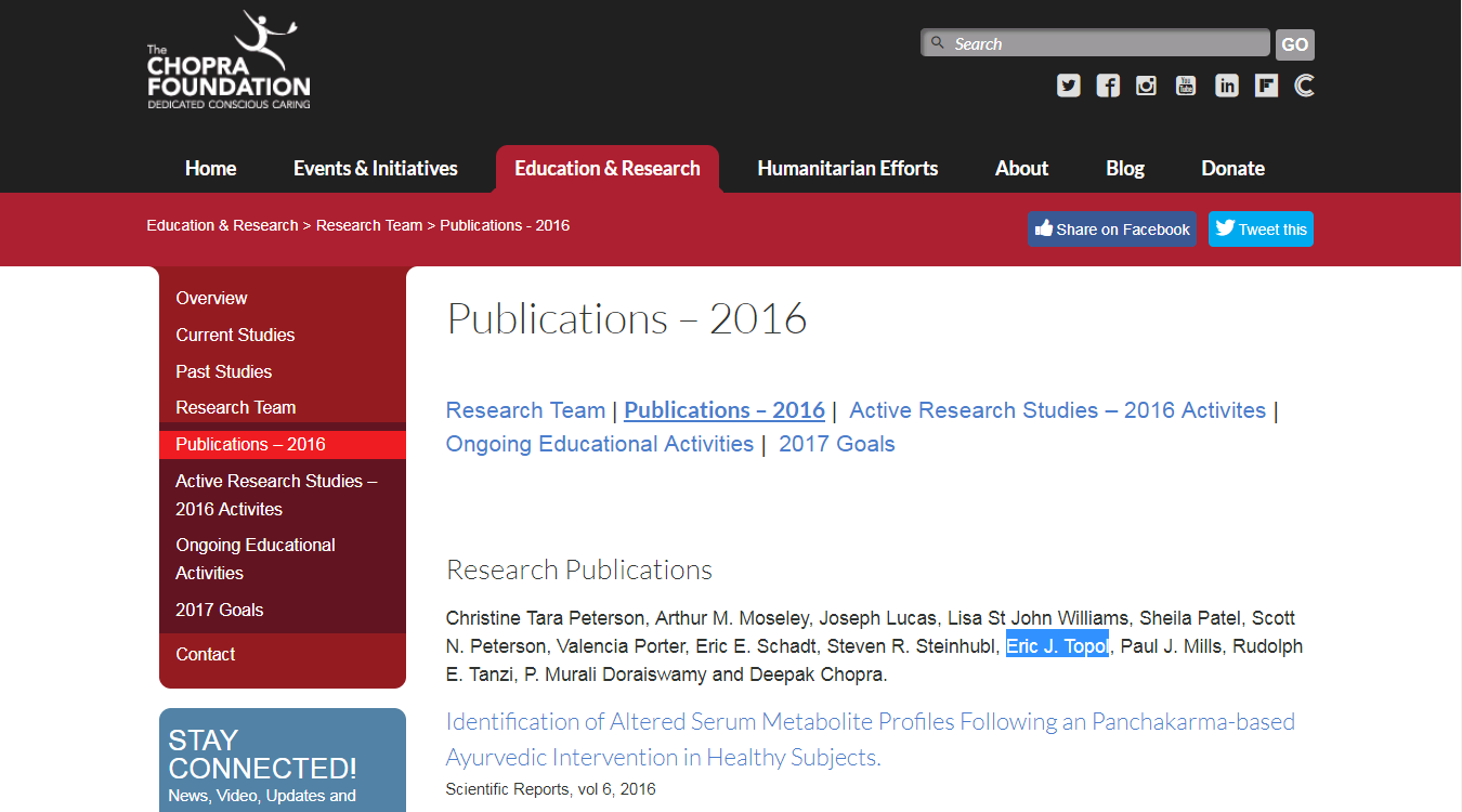 Much more could be said about Chopra and the rest of his remunerative career, but it will suffice to outsource this to RationalWiki, Orac at Respectful Insolence, and Scævola. There is no point in preaching to the choir (also, Deepak Chopra hires lawyers). Moreover, it would distract us from the original question: Why was Eric Topol’s name co-opted for the Ayurveda paper?