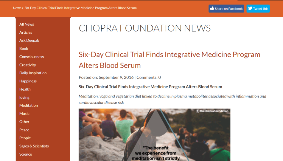 The following post from my regular contributor Smut Clyde will take you on a meditative Ayurvedic trip where the most respectable of research institutions and their world-renowned academics were seen dancing with the Guru Deepak Chopra himself. Famous cardiologist and medical writer Eric Topol and the Nobel Prize winner Elizabeth Blackburn were just two most prominent US academics listed on Chopra’s Panchakarma clinical trial, Self-Directed Biological Transformation Initiative (SBTI). Scripps Research Institute and University of California San Diego (UCSD) used to happily advertise for Chopra’s meditation studies.