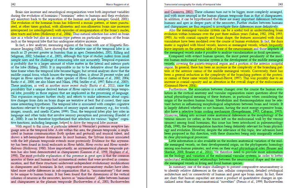 The novelty of the method was to dispense with a dedicated transcranial scanner (high-powered enough to send ultrasound pulses through the skull and return a signal from the cerebral interior) and use instead a standard LA523 soft-tissue scanner that was on hand, manipulating scans in Photoshop to achieve the desired appearance. Suffice to say that the technique did not catch on, with no subsequent applications…. though there were precedents, in the form of other papers by main author Ruggiero’s team. What inspires me to touch on one of these (not in Frontiers, but an Italian embryology journal) is the extent of its plagiarism.