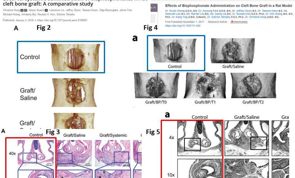 The authors will probably explain that it all was part of same experimentla series, hence the reuse of “Control” bone image was justified. Yet note that the image for “Graft/Saline” which is actually another kind of control (for the experimental intervention) was not reused. This means these are different experiments after all. Maybe for some reason the authors lacked a control for the PloS One paper, so they used one from an older experiment, because who cares.