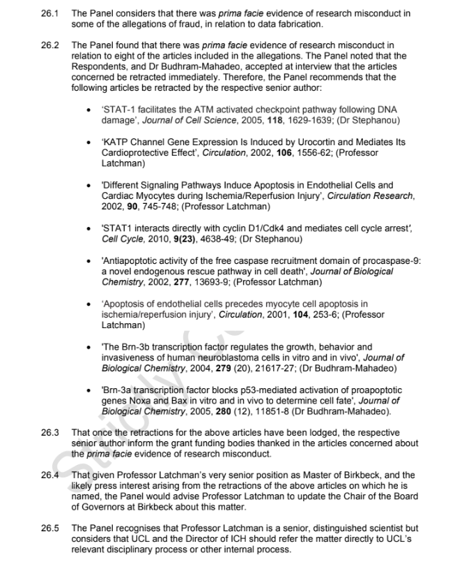 The panel interviewed both respondents, Latchman in person, Stephanou by video conference. This committee screened only 6 papers of the 32, and did not decide on retractions, but whether misconduct has occurred and a further investigation was merited. This was the conclusion: