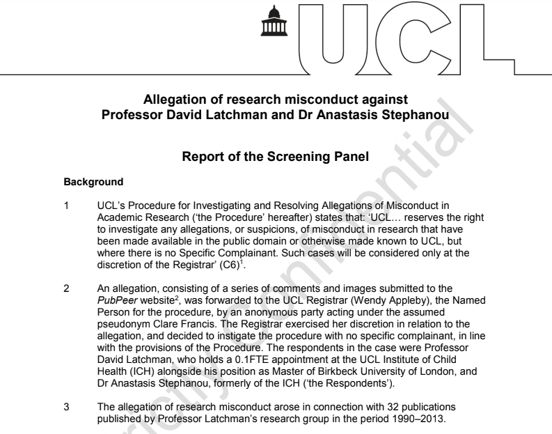 The annual investigations of Latchman between 2014 and 2017 happened because of persistent email notifications by the data integrity sleuth Clare Francis, who also produced much of the PubPeer evidence, which now stands at 68 papers. Every single investigation report found the Master of Birkbeck guilty of research misconduct by recklessness, due to his impressively abysmal supervision and his obsessive desire to be main coauthor on every paper leaving his lab.
