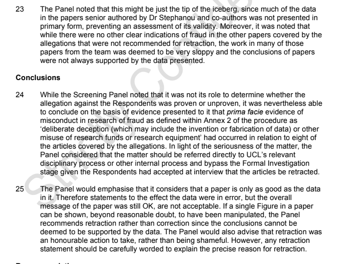 - “The Panel found that all the articles that had prima facie evidence of research misconduct supporting the allegations of fraud were produced by the Cardiovascular Biology sub-group headed by Dr Stephanou. In light of the Panel’s findings, the Director of ICH and Dr Stephanou’s Head of Department are invited to consider the appropriateness of his supervision of research students and whether it is appropriate that he be allowed to publish papers and write grant proposals.