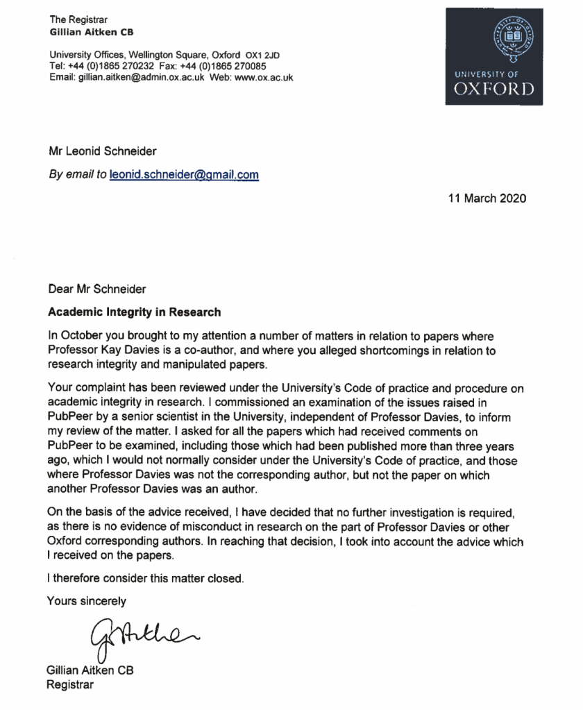 “Your complaint has been reviewed under the University’s Code of practice and procedure on academic integrity in research. I commissioned an examination of the issues raised in PubPeer by a senior scientist in the University, independent of Professor Davies, to inform my review of the matter. I asked for all the papers which had received comments on