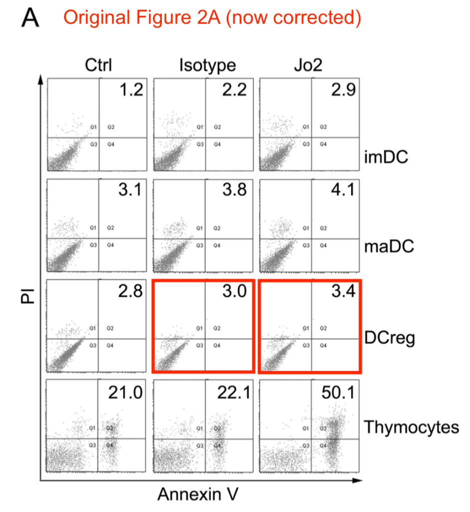 Now FACSimiles and “flaw cytometry’ feature heavily in the oeuvre of Dr Cao across the 16-year span 2003-2019, at least in the fraction of that oeuvre that has so far provoked discussion in threads at PubPeer. In many cases the use of a duplicate or almost-duplicate plot was an innocent mistake, quickly corrected (Qian et al, 2013 [12]) or subsequently acknowledged (Liu et al., 2018 [15]).
