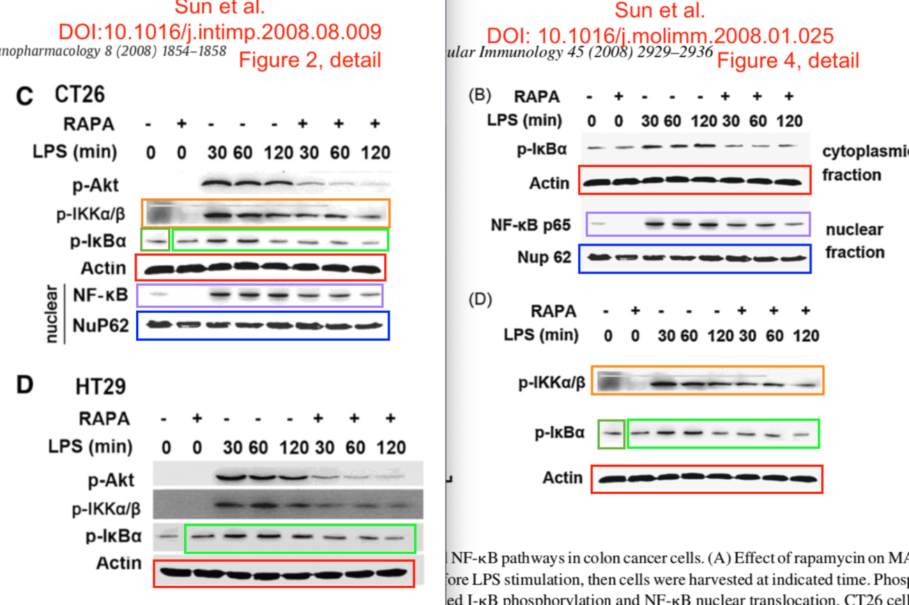 7. “Rapamycin suppresses TLR4-triggered IL-6 and PGE(2) production of colon cancer cells by inhibiting TLR4 expression and NF-kappaB activation”, Qiaoling Sun, Qiuyang Liu, Yuanyuan Zheng, Xuetao Cao (2008a). Molecular Immunology doi: 10.1016/j.molimm.2008.01.025 [PubPeer].
