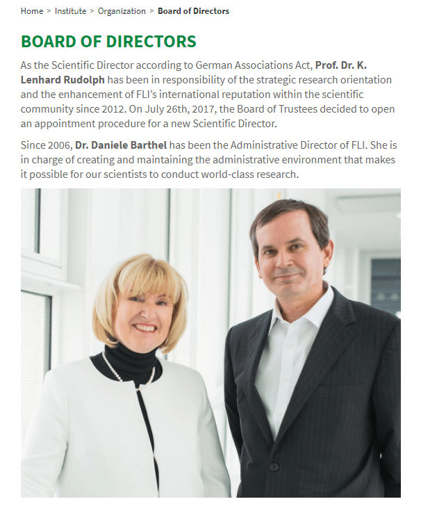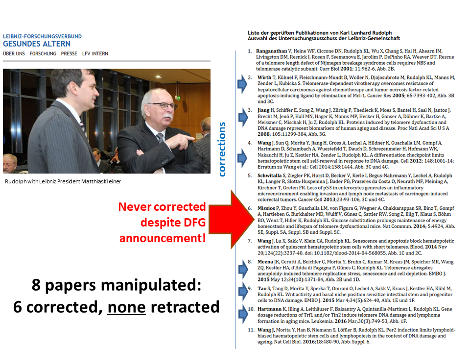Rudolph, then FLI scientific director, was found guilty of research misconduct twice, first by his own Leibniz Society (which operates the FLI in Jena) and by the Germany Research Council, the DFG, which barred the telomere researcher from funding for 2 years (read here and here). Prior to those misconduct findings, Rudolph’s activities caused a police raid on FLI because of animal abuse – mice were experimented upon without ethical approval. FLI was then banned from performing any animal experiments whatsoever.