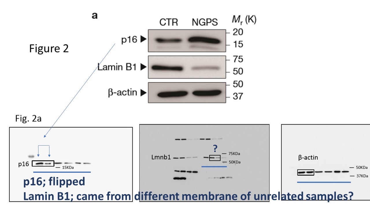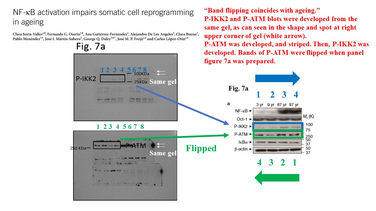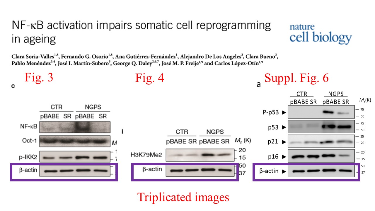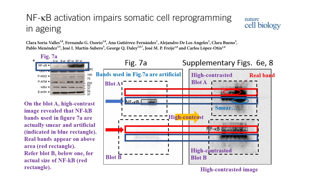 In early 2018, various anomalies (suspicious image fabrications, sample swapping and arbitrary statistics) were reported in the Soria-Valles Nature Cell Biology (NCB) paper from 2015 on several websites including PubPeer. It is worth noting that Dean George Daley is one of the principal investigator co-authors who supervised this work. Her paper with Daley and Lopez-Otin focused on a signaling pathway that blocked the generation of stem cells. Most interestingly, she claimed to be able to generate stem cells more efficiently from patients with progeria syndrome. Clara Soria-Valles left the Daley laboratory when the accusations on PubPeer began to surge.
