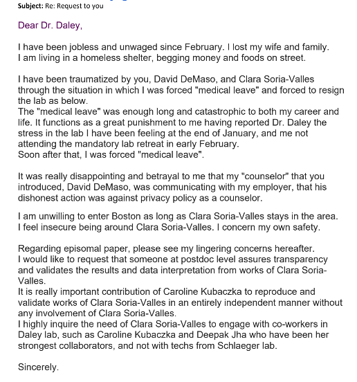 I was deeply troubled. When Dean Daley sent me a draft of the episome paper in April 2018, I requested that Dean Daley have other members of the lab replicate her work. In early May 2018, I emailed the entire lab my concern about the integrity of the episome paper. Dean Daley fired me on the same day.