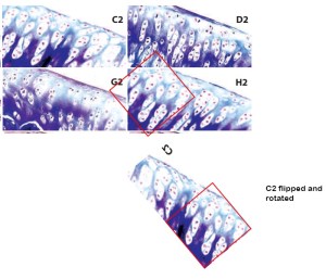 In Fig 1C a slice of mouse knee appears in the right-hand panel to illustrate how well the triptoline treatment alleviated the arthritis induced by collagen injection. Its condition is indeed similar to the Control slice shown in the left-hand panel. In fact they are overlapping details of a single image (with a horizontal flip and a slight rotation) .