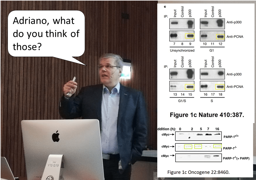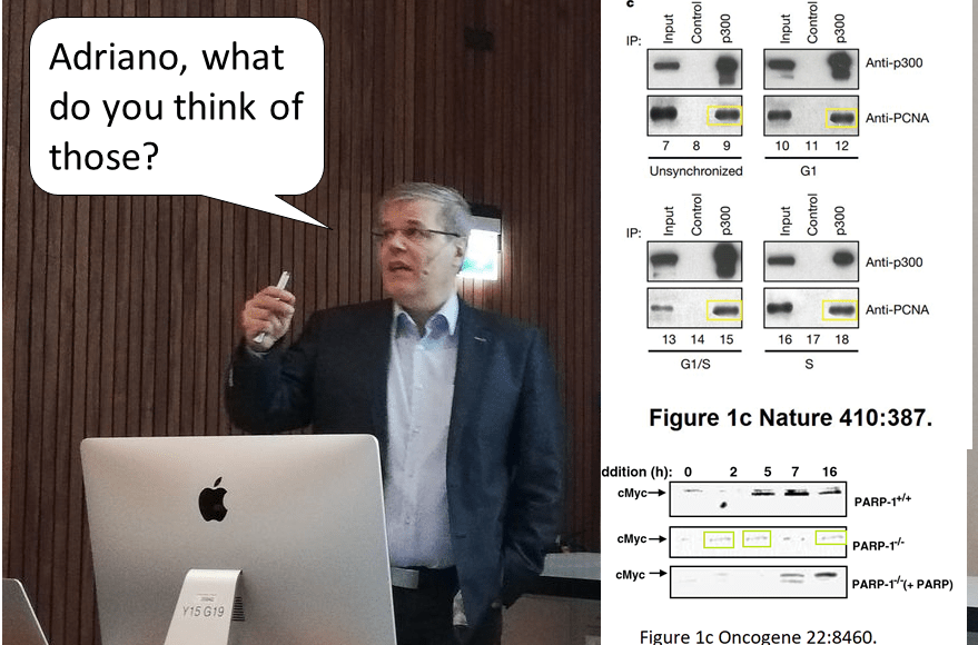 To conclude, a paper coauthored by Hottiger with the infamous Gad Asher as first author, back then in the lab of Ueli Schibler in Geneva. The Israeli biologist Asher has 11 papers on PubPeer flagged for blatant data fakery, it is yet another question if his Weizmann Institute cares about it either way. Or for that matter the elite journal Cell, who are prepared to defend research fraud even against demands from universities. Including in fact even from Weizmann Institute.