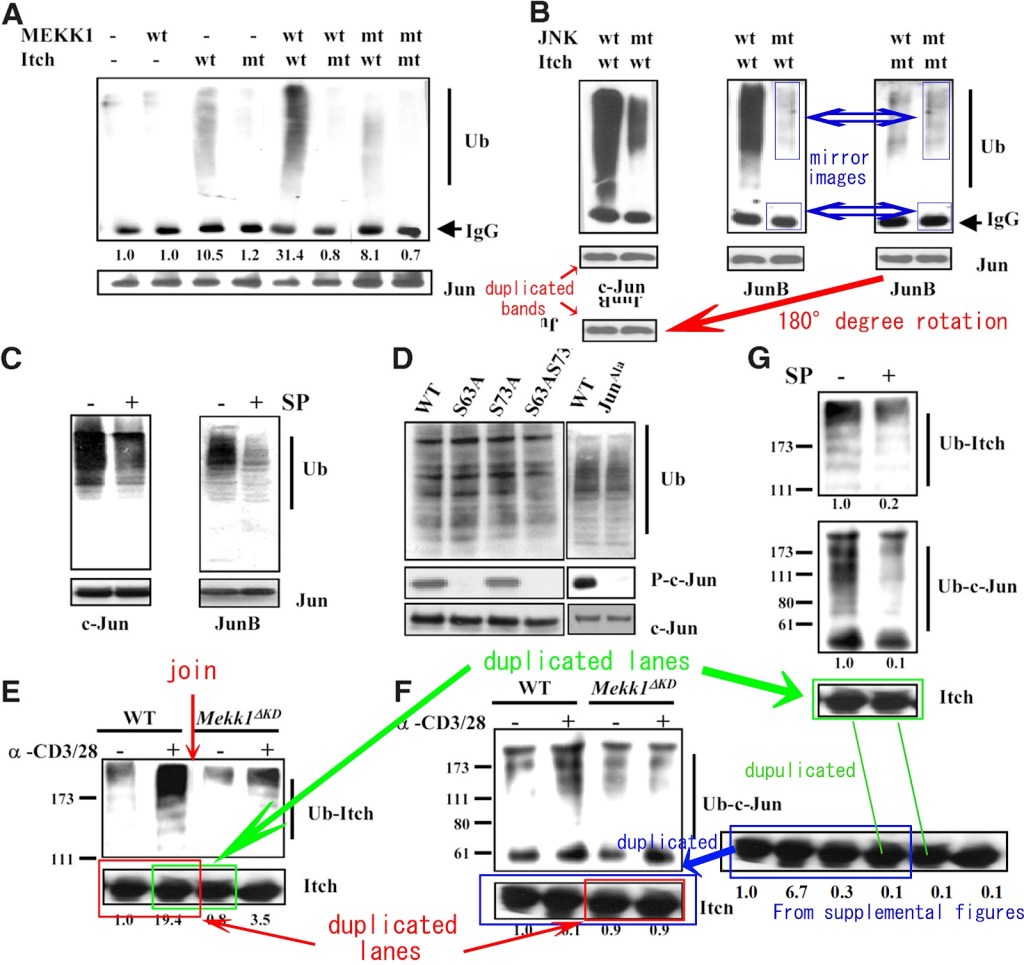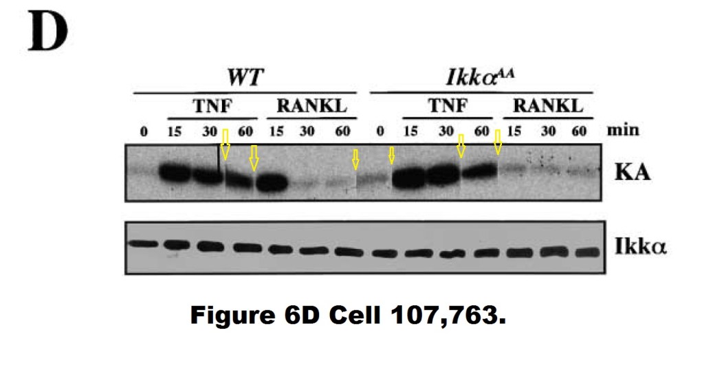 Now, this figure is bizarre. The Ikk-alpha blot serves as loading control here and looks perfectly normal. But the KA blot? It is a Frankenstein monster made of many different pieces. What happened to the original experiment and its result, that the authors had to resort to such, ahem, collage?