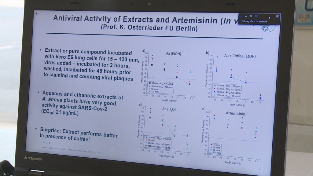 Chemists at the Max Planck Institute for Colloids and Interfaces in Potsdam, in close cooperation with virologists from the Free University of Berlin, have shown in laboratory studies that aqueous and ethanolic extracts of specially grown mugwort plants ( A. annua ) are effective in combatting the new corona virus, which is the trigger of the COIVID-19 [sic!] pandemic. Human clinical trials begin at the University of Kentucky, USA, to test the effectiveness of teas and coffee containing A. annua and the anti-malarial drug artesunate.