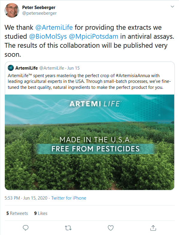 “The study is also piquant because a “conflict of interest” is indicated in small print that Peter Seeberger not only serves as director of the Max Planck Institute, but also as shareholder at Artemi-Life, which “currently sells a range of teas and coffees which can be supplemented with Artemisia annua“.