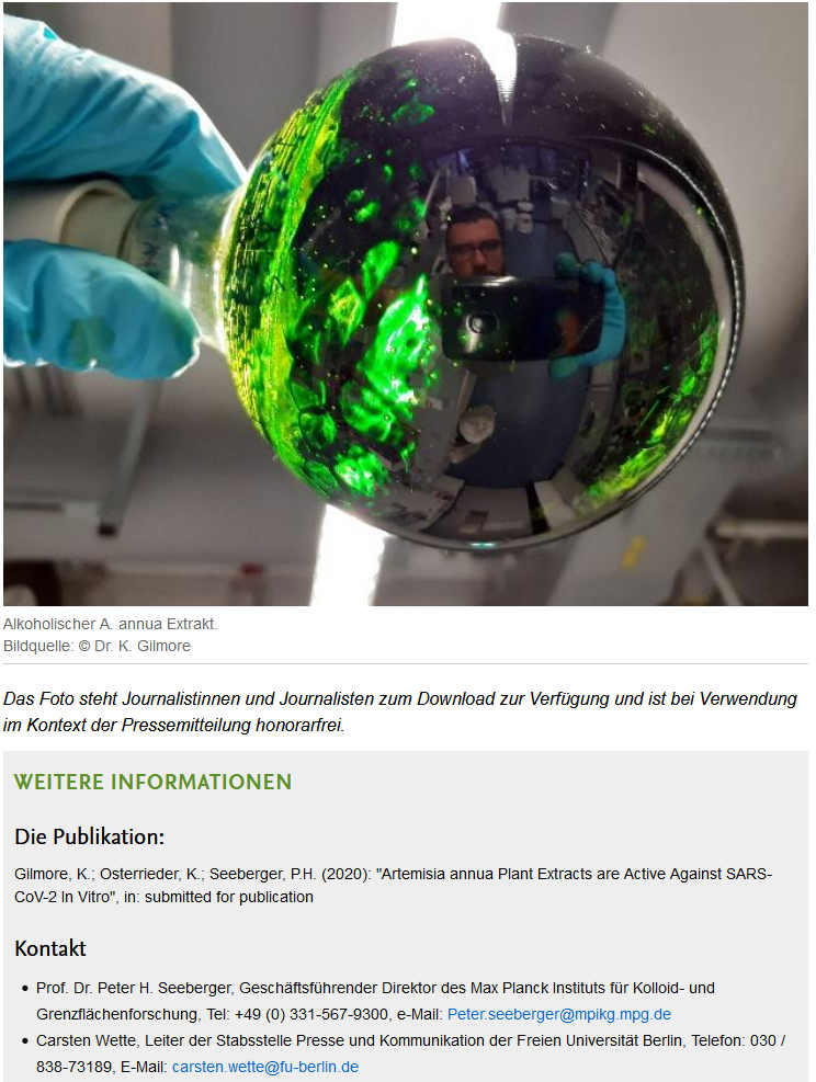The press release from 24 June mentioned no animal studies, only in vitro results. Both the responsible virologist Osterrieder and his FU Berlin refused all communication with me. My repeated questions whether Osterrieder might have a financial conflict of interests regarding ArtemiFlow went unanswered. None of mine and my readers’ business probably.