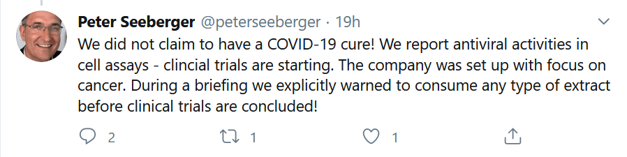 Before COVID-19, there was cancer. Professor Seeberger by now apparently forgot that he actually founded ArtemiFlow to treat malaria, maybe because there was “little interest”. He now insists on Twitter that the artemisinin company was founded “with focus on cancer”.
