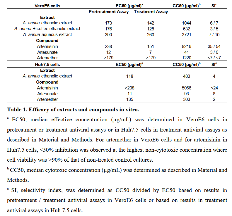 Yesterday Professors Seeberger, Osterrieder and Gilmore published their research as preprint: Gilmore et al In vitro efficacy of Artemisinin-based treatments against SARS-CoV-2 bioRxiv 2020. You might recall the press release about the high antiviral efficacy of aqueous or ethanol plant extracts in vitro, and the clinical trials which started with ArtemiLife teas and coffees? Well, according to the preprint, the effective concentration (EC50) lies in a 3-digit mg/ml range. The prized A. annua + coffee ethanolic extract, promoted in the press release, proved deadly to cells at just 3.5 times of its EC50 concentration. The most potent drug analysed, artesunate, proved also the most cytotoxic.