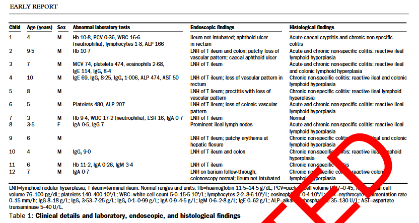 It was not the only case where children with no significant abnormalities in their intestines were diagnosed with “non-specific colitis” and treated with harsh medication. Children with constipation were diagnosed with an inflammatory bowel disease, which makes no sense to an expert. The fraud was published in the Table 1 of the 1998 Lancet paper, featuring 12 children: