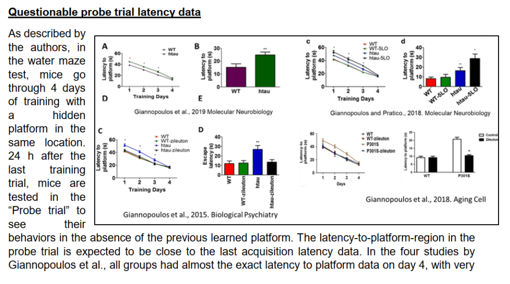 • Questionable probe trial latency data“, where Pratico’s mice proved to be cognitively very uniform and otherwise peculiar, with near-identical and surprisingly straight learning curves. Basically, either the mice used to serve in Italian military and marched to Pratico’s commands, or something else was going on.