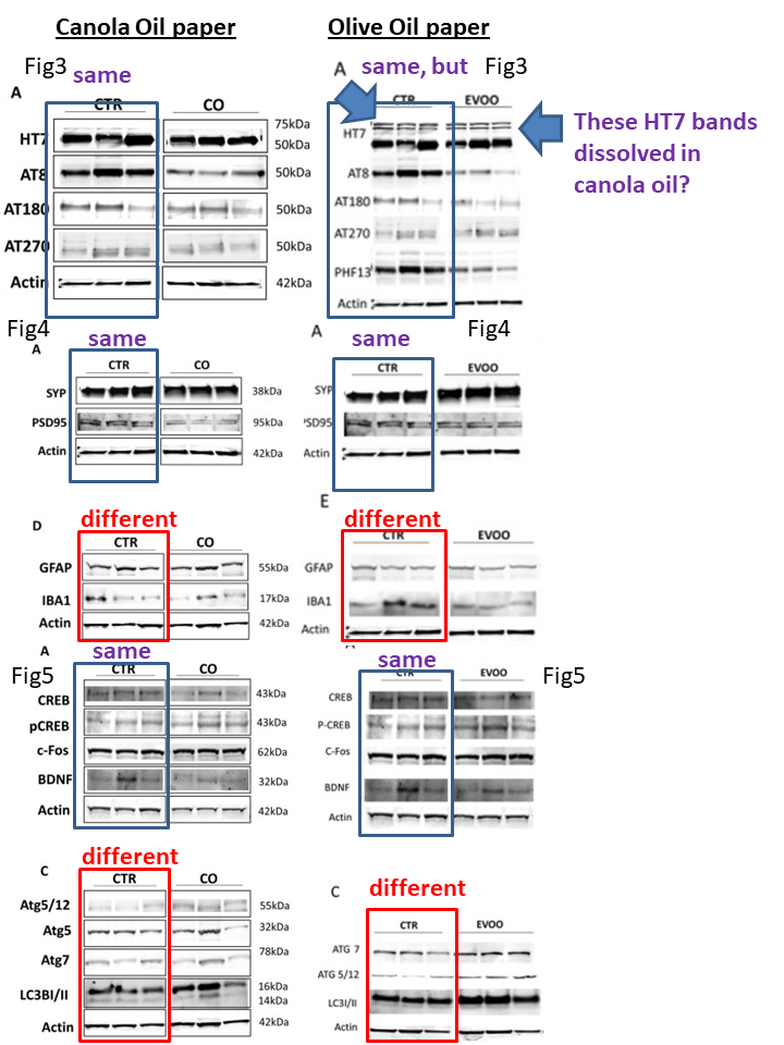 The issue here is that it seems the control mice are same, because the experiment with canola and olive oils was done simultaneously, with same control mice. This is why the authors reused controls (something they should have disclosed in the paper), but the really puzzling bit is why they replaced the PS1 blot. The canola oil (CO) paper says: “Compared with controls, no changes in the levels of all proteins investigated were observed when the canola oil group was compared with control mice (i.e., APP, BACE1, ADAM10, Nicastrin, Pen 2, PS1, APH1) (Fig. 2D,E)“. But the olive oil (EVOO) paper says: “No changes were observed in the levels of APP and three of the four components of γ‐secretase (i.e., APH1, nicastrin, and Pen2) when the two groups were compared (Fig. 2E and F)“, implying there were changes in the fourth component, PS1. But then again, a closer examination of the western blot signal suggests the authors might have misinterpreted their findings of “no changes” completely.