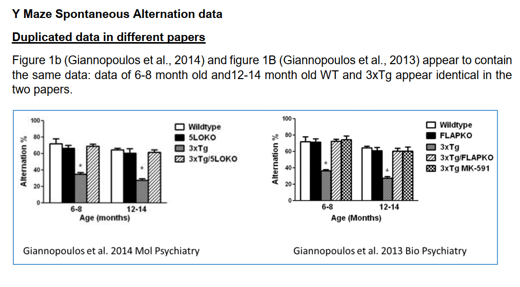 You might say, so what, Mr Giannopoulos might have ACCIDENTALLY used his old research results as representative stand-ins for his predicted new results. But some of the data from that Mol Neurobiol 2018 paper was first published in two other papers from Pratico lab, where Giannapoulos is not a coauthor.