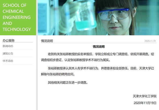 As soon as the report became public, Zhang was immediately sacked by Tianjin University, as Lu Chen found out. The press release by the School of Chemical Engineering from 19 November 2020 said: