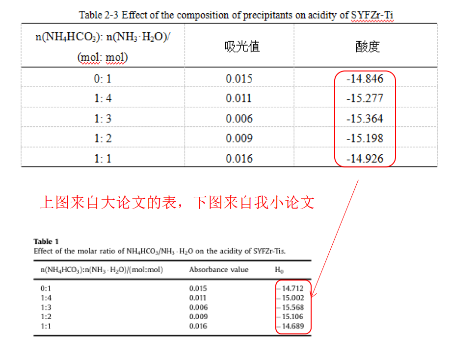 According to the formula in the paper, it is impossible to have H0 such high. I also failed to obtain the absorbance values as listed in the tables, no matter how hard I try. I was scolded by Zhang because of this. So these tables are all fake, and they are the basis of my analysis. One sees that the H0 in my paper is different from the values in the thesis. It was because the reviewer pointed out that the value doesn’t seem right, so Zhang asked me to make up another value. In fact, if one calculates with the formula in the paper used to compute H0, a logarithm with negative argument will appear in the computation, so it is just mathematically impossible.