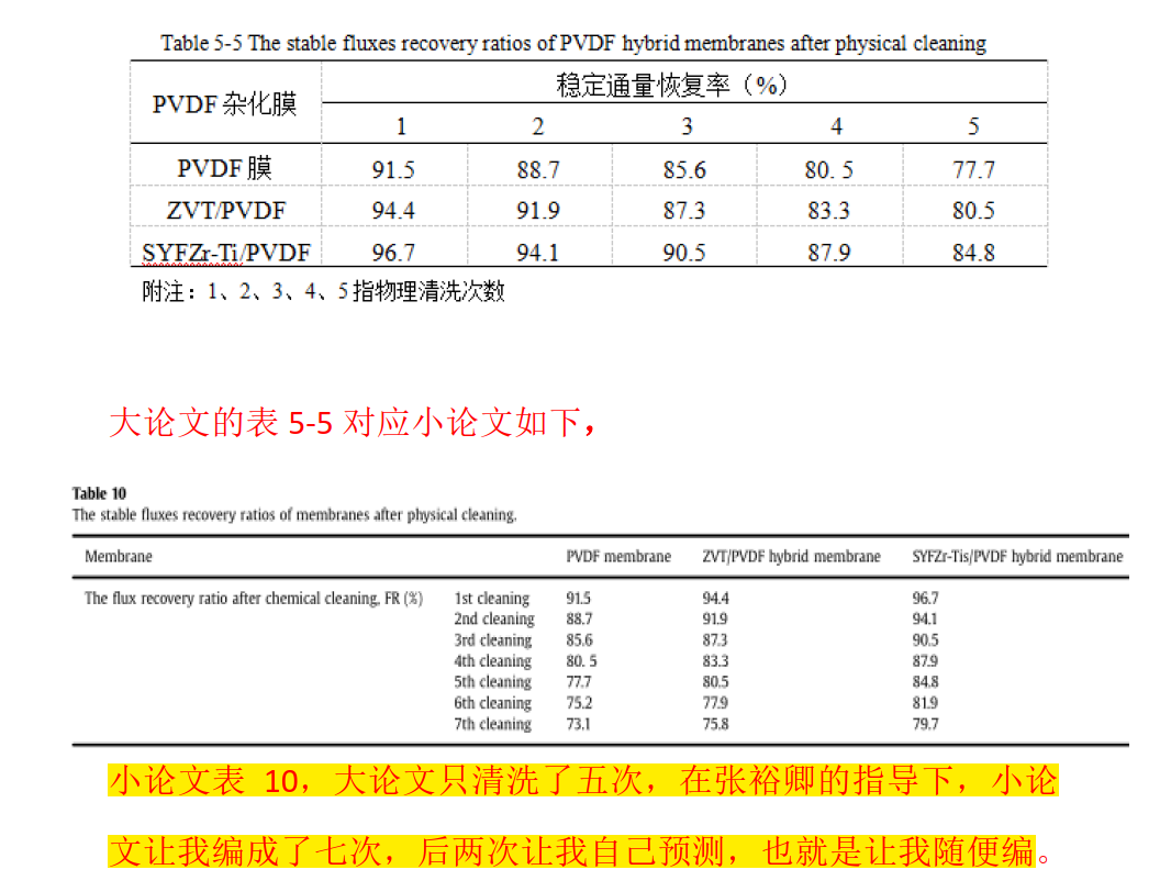 contains a similar problem. Three values are just impossible. Back to my own paper. Tables 5-5 and 5-6 of the thesis listed five cleanings. Tables 10 and 11 in my paper listed 7 cleaning. Zhang guided to me to add two more cleaning. For the last two, he asked me to “predict” a value, which means making up values. Of course, values for the previous five cleanings were also fake. I tried to reproduce and find them all wrong. I was scolded by Zhang for this.