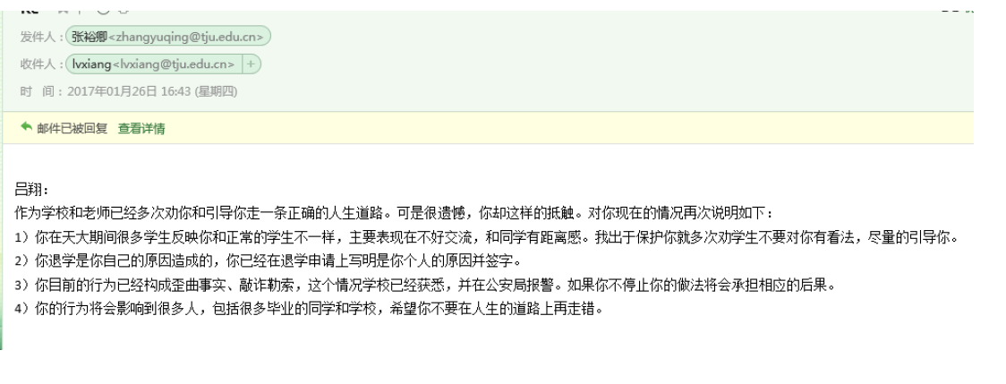 In 2017, I communicated once with him about his fraud. I didn’t expect him to repent. But he also said that I have misrepresented the facts and threatened that he has reported me to the police. Below is a screenshot. Now three years have passed, all students related to Zhang that I know of have graduated. I have nothing to worry about. So I decided to report him. Academic scum like him must be punished! I hope that TJU could follow the facts, follow the law and regulations, be fair and just, and punish Zhang Yuqing publicly!