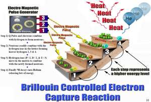 Brillouin Energy, Brilliant Light wannabees. Their point of difference is to add “Q-pulse electrical stimulation” to the mix, which push the electrode-bound hydrogen atoms into their lower-energy state by merging electrons and nuclei into hydrinos neutroids neutrons. Having reported a four-fold return on energy input (comparable to a heat pump), the company triumphantly upgraded this to two-fold. The main evidence that Brillouin provide for the functionality of their heat sources consists of press releases about anonymous Pacific / Asian industrialists licensing the technology, revolutionising the world in 2013 and again in 2018.