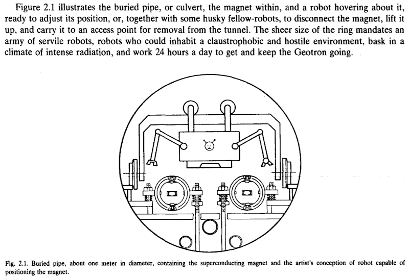 Here to conclude is Figure 2.1, depicting a happy robot maintaining the magnets within an accelerator for neutrino-beam generation, from ‘Neutrino exploration of the earth‘ (De Rújula, Glashow, Wilson & Charpak) – my favourite physics paper EVER. It is not at all relevant to the post but it shows that I was reading Physics Reports in 1983, just in case anyone questions my credentials.