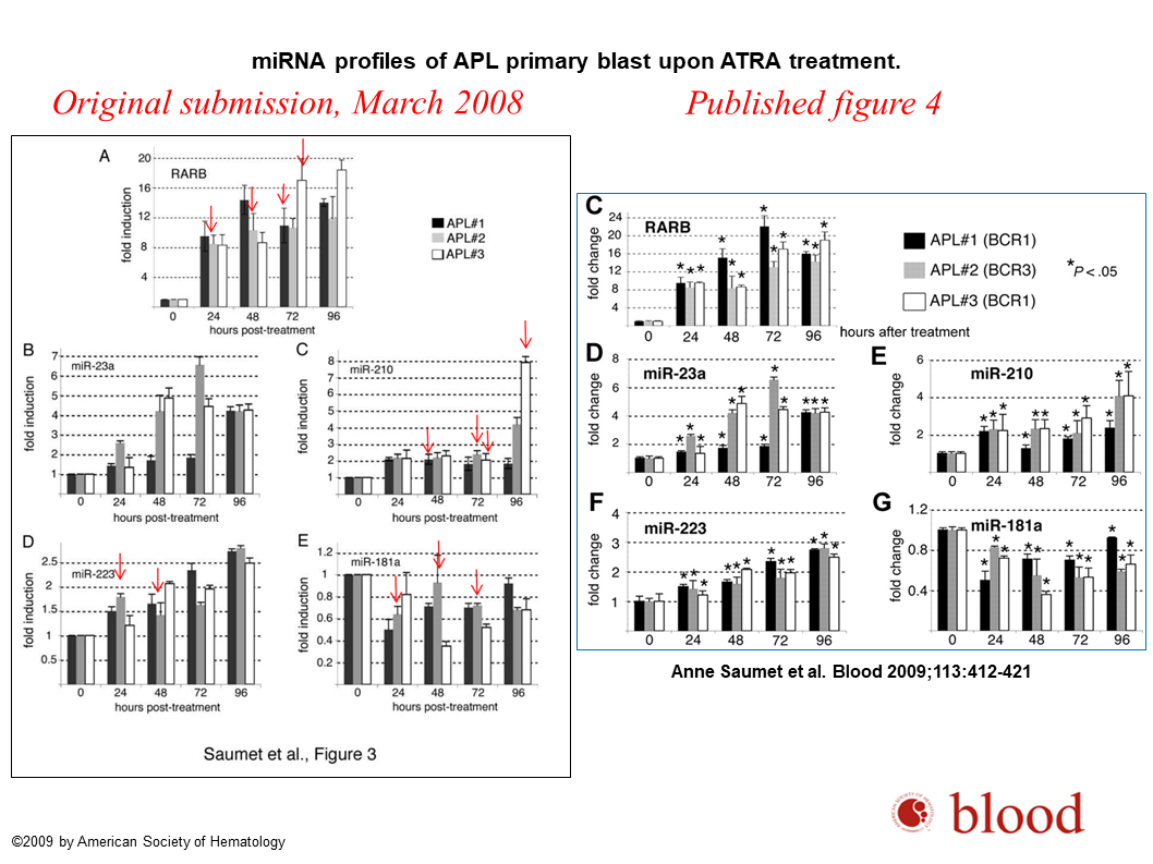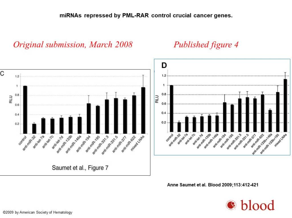 The originally submitted Figure 3 contains real-time quantitative PCR (RT-qPCR) data for the miRNA expression in cells of 3 different leukemia patients. When compared to the Figure 4 in the published paper, one quickly notices that certain selected qRT-PCR values inside presented experiments have been changed. Why did the authors do this? Well, during the peer review, “Referee 2” has criticised the data from the patient samples as containing „significant variability”, mentioning that “primary APL cultures are unstable and often associated with significant number of dying cells“. To that, Lecellier has replied in the rebuttal letter: