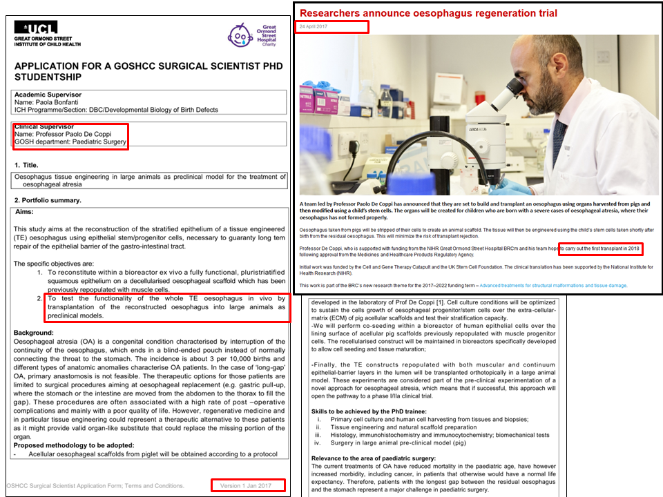 In early 2017, De Coppi was poised to transplant decell-recell oesophagus into children, but that clinical trial with ten participants, announced in national media, somehow got averted in the nick of time. That was because the Macchiarini scandal just exploded beyond UCL’s and GOSH’s control, and De Coppi was asked to maybe try it with mice and pigs first. Guess who his main collaborator on these preclinical projects was.