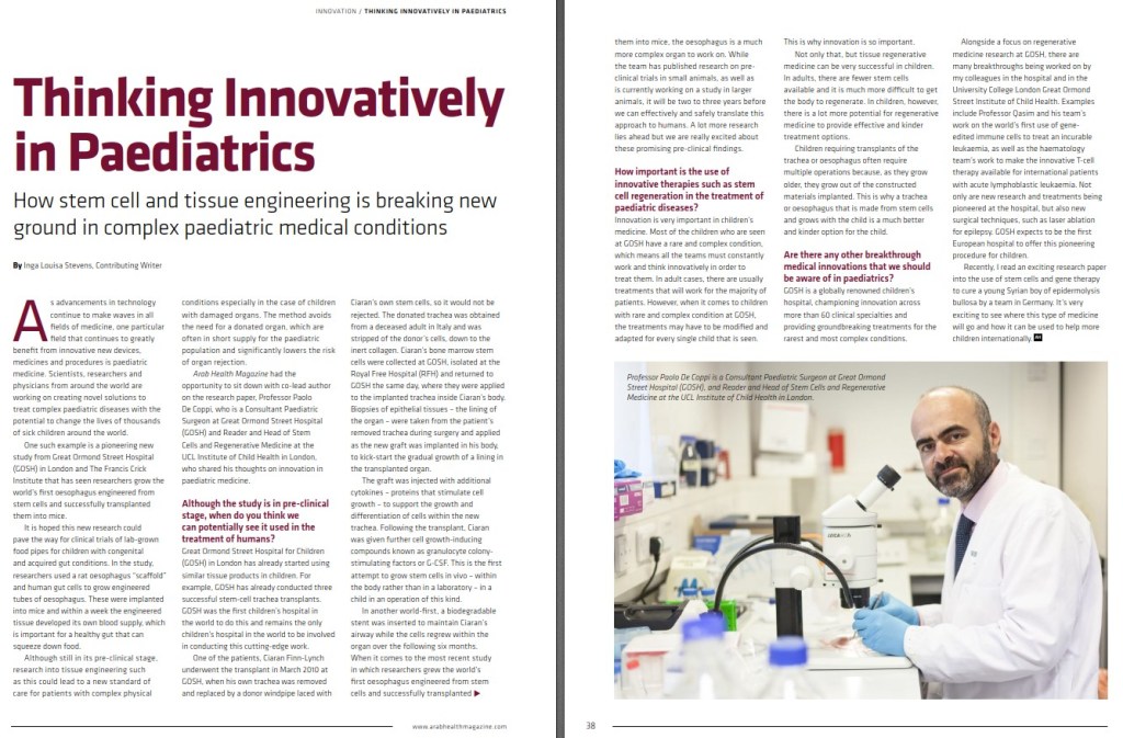 Luca Urbani , Carlotta Camilli , Demetra-Ellie Phylactopoulos , Claire Crowley , Dipa Natarajan , Federico Scottoni , Panayiotis Maghsoudlou , Conor J. McCann , Alessandro Filippo Pellegata , Anna Urciuolo , Koichi Deguchi , Sahira Khalaf , Salvatore Ferdinando Aruta , Maria Cristina Signorelli , David Kiely , Edward Hannon , Matteo Trevisan , Rui Rachel Wong , Marc Olivier Baradez , Dale Moulding , Alex Virasami, Asllan Gjinovci, Stavros Loukogeorgakis, Sara Mantero, Nikhil Thapar, Neil Sebire, Simon Eaton, Mark Lowdell, Giulio Cossu, Paola Bonfanti, Paolo De Coppi Multi-stage bioengineering of a layered oesophagus with in vitro expanded muscle and epithelial adult progenitors Nature Communications (2018) doi: 10.1038/s41467-018-06385-w