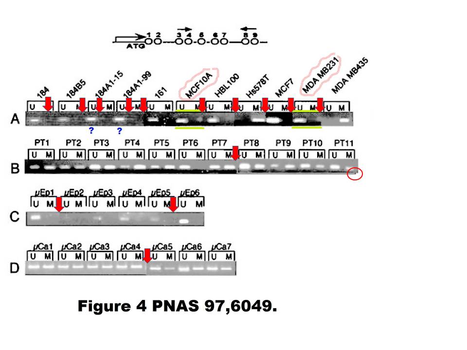 These SFRP1 bands do look quite unexpectedly similar though. And the rest of the figure is a bit strange, too. Again those strange box-shaped shadows lacking all background, difficult to explain with image compression alone… In one case, a RASSf1A band looks as if it is inside a box.