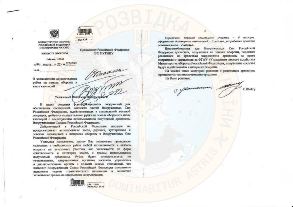 “The occupier state plans mass cut down Ukrainian forests. This is about the letter of the Minister of Defense of Russia Shoigu “About the possibility of demolition on the lands of defense”, which is personally addressed to Putin.