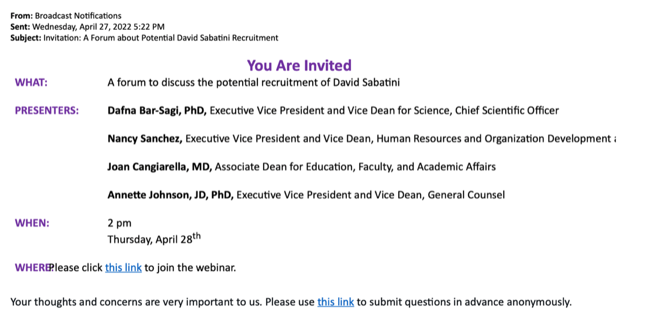 One aspect which rarely gets mentioned: Sabatini’s father, David Sabatini Senior, is emeritus professor at NYU Langone Health, and he is most likely also pulling the strings there to get his son employed. So now you have 4 very powerful men pushing for this recruitment. To balance it out, they sent 4 women to advertise for Sabatini among the faculty, the argument presumably being, look, women endorse mTORman and these four can vouchsafe he never harassed them!