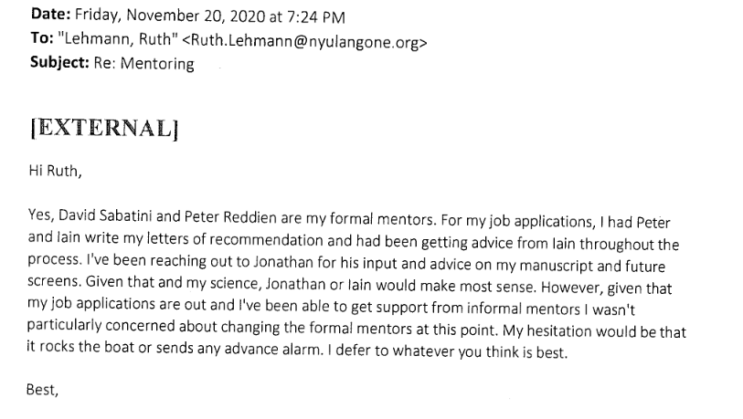 Thing is, NYU Langone Health used to be the former employer of Ruth Lehmann, the current Whitehead Institute director, whom Sabatini is currently suing for helping the victim of his sexual predation. The litigious mTORman supplied the court with an Exhibit K which contains emails between Lehmann and this victim, where the latter asks the former for help to find a new mentor due to problems with Sabatini. Here is one such email: