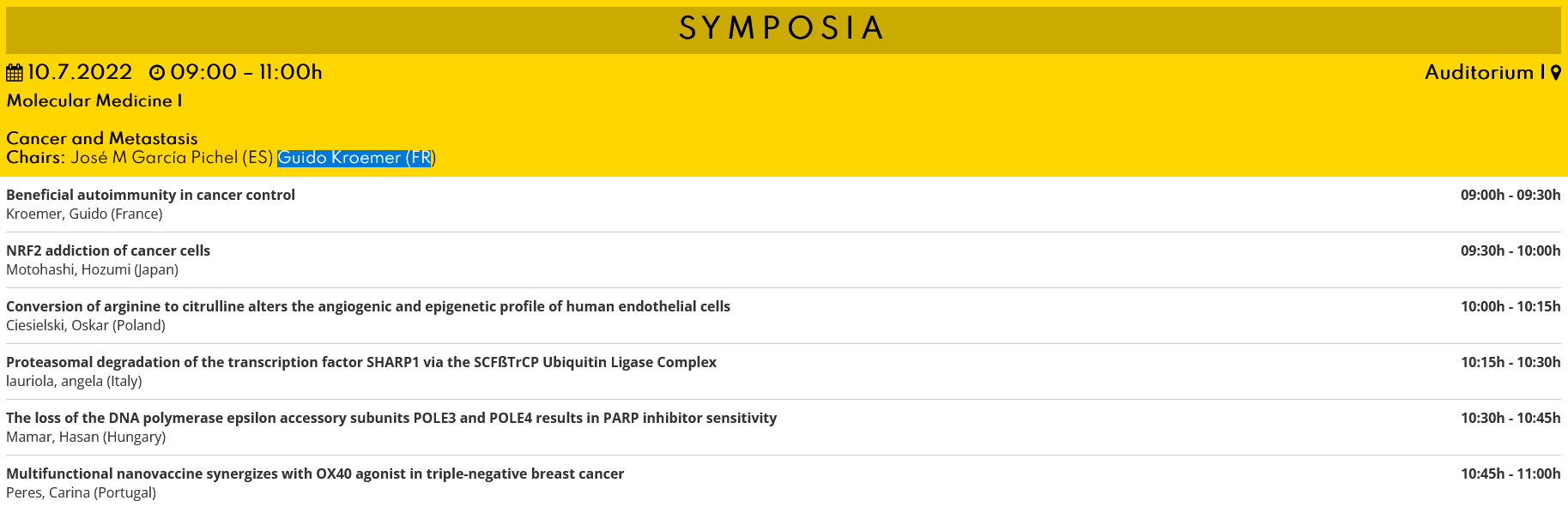 Kroemer will also be chairing the “Cancer and Metastasis” symposium on 10 July 2022.