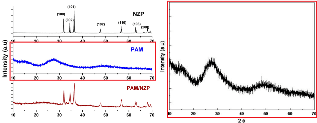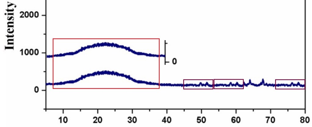 When x-rays are not being absorbed by a material, they’re reflecting off it, assuming that they encounter a crystal at the right angle for the x-ray wavelength to match the spacing between crystal layers. This is where we come under the rubric of x-ray diffraction. Within this domain, suspicions are quickly aroused by a diffractogram where a stretch of small-angle baseline is all glitchy and stitched together from copy-paste, with a longer extended glitch in the intermediate angular range. It turns out to be g-C3N4, which is (I think) a form of altered carbon modified graphene… definitely not an amorphous material, but not entirely morphous either.
