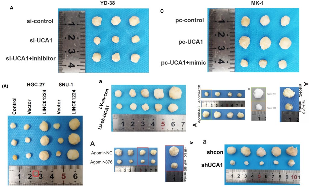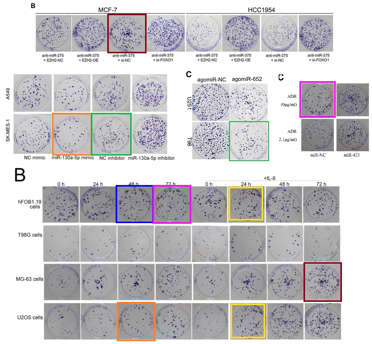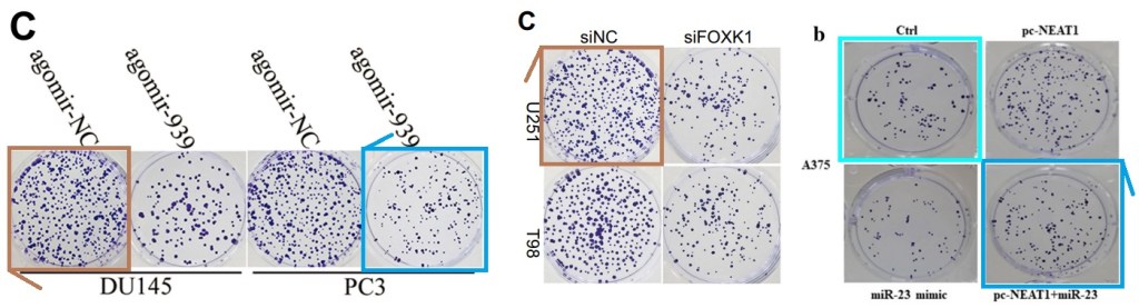Recurring elements included a block of Transwell-assay and colony-formation-assay images at the end of each Act (Figures 2, 4 and 5, it might be) to quantify the authors’ claim that more or less of the ncRNA in question modulates the migratory or invasive or proliferative proclivities of that cancer cell-line.