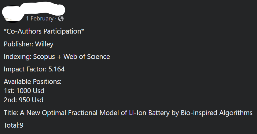 “On the 1st of February, an advert was posted on Facebook selling authorships of a paper. I believe that the original intended journal was Wiley’s International Journal of Energy Research, which has a 2 year impact factor of 5.164. However, that submission must have been rejected.”