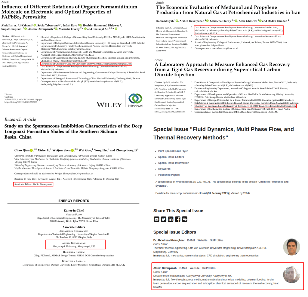 Afshin Davarpanah, whose PubPeer record is telling, but there are more stories to be told about him. One story is the use of fake affiliations (Cordoba, Medan, Luleå). The other is multiple editorial positions (Geofluids – Hindawi, Processes – MDPI, Energy Reports – Elsevier, not counting those with even more predatory publishers) occupied even without a degree. A brief summary is offered by a collage below.