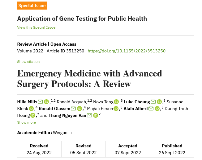 Hilla Mills , Ronald Acquah , Nova Tang , Luke Cheung, Susanne Klenk , Ronald Glassen , Magali Pirson , Alain Albert , Duong Trinh Hoang , Thang Nguyen Van Emergency Medicine with Advanced Surgery Protocols: A Review Journal of Environmental and Public Health (2022) doi: 10.1155/2022/3513250