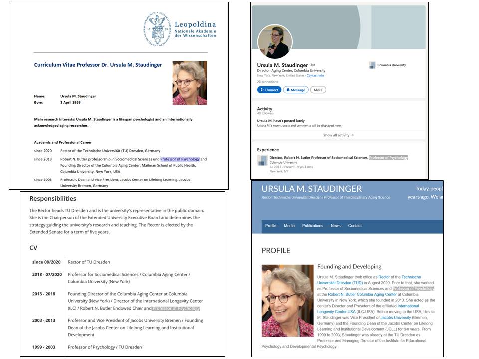 In several of Staudinger’s current CVs she states to have been “Professor of Psychology” at the Columbia University. E.g. her CV at the German Academy of Sciences Leopoldina says “Professorin für Sozialmedizin und für Psychologie an der Columbia University” (2013 till now), her current official profile at TU Dresden says “Professor of Psychology” at Columbia (2013-2018), but also her personal LinkedIn profile says “Professor of Psychology Columbia University” (2013-now) and even her personal website ursulastaudinger.com says “Professor of Psychology at the Robert N. Butler Columbia Aging Center at Columbia University in New York” (2013-2020).